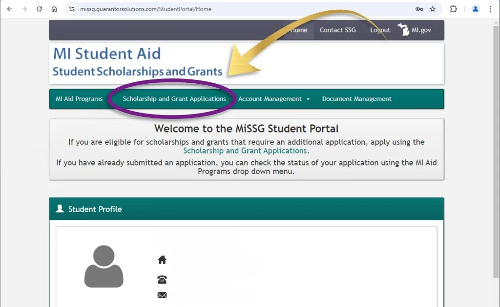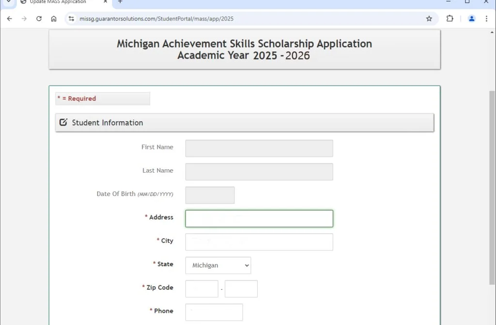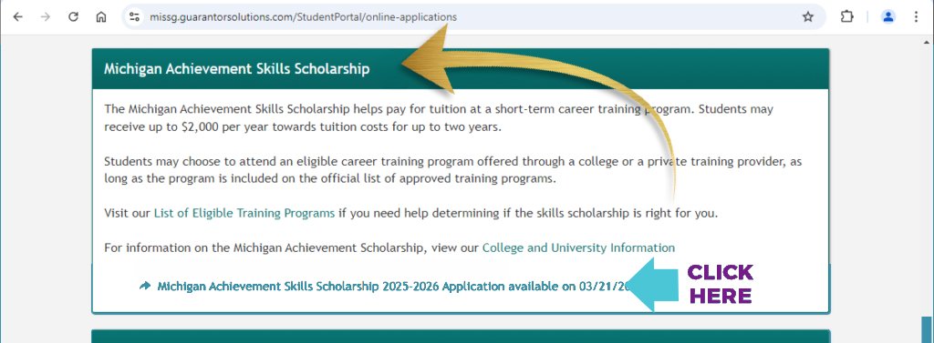 Scroll down to the “Michigan Achievement Skills Scholarship” and click the 2025-2026 Scholarship Application